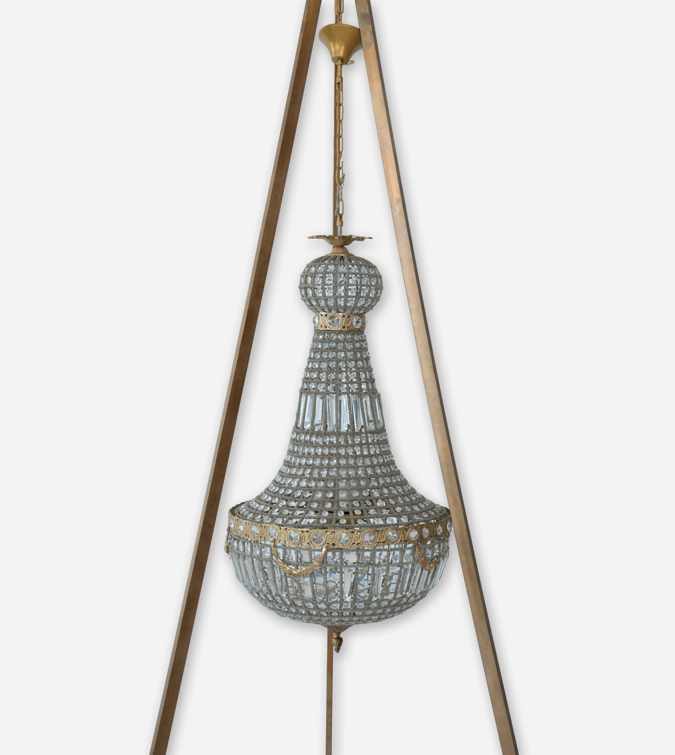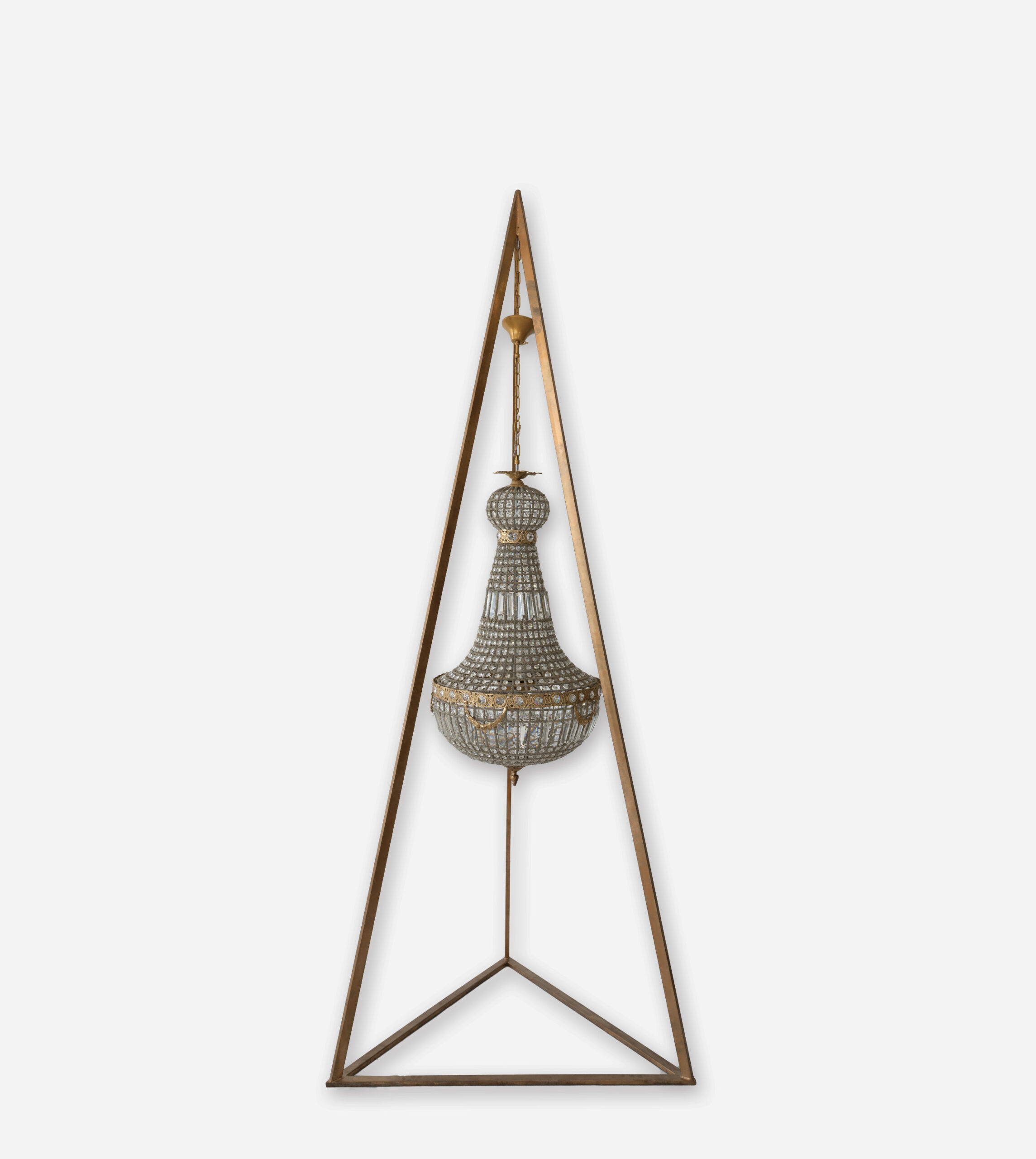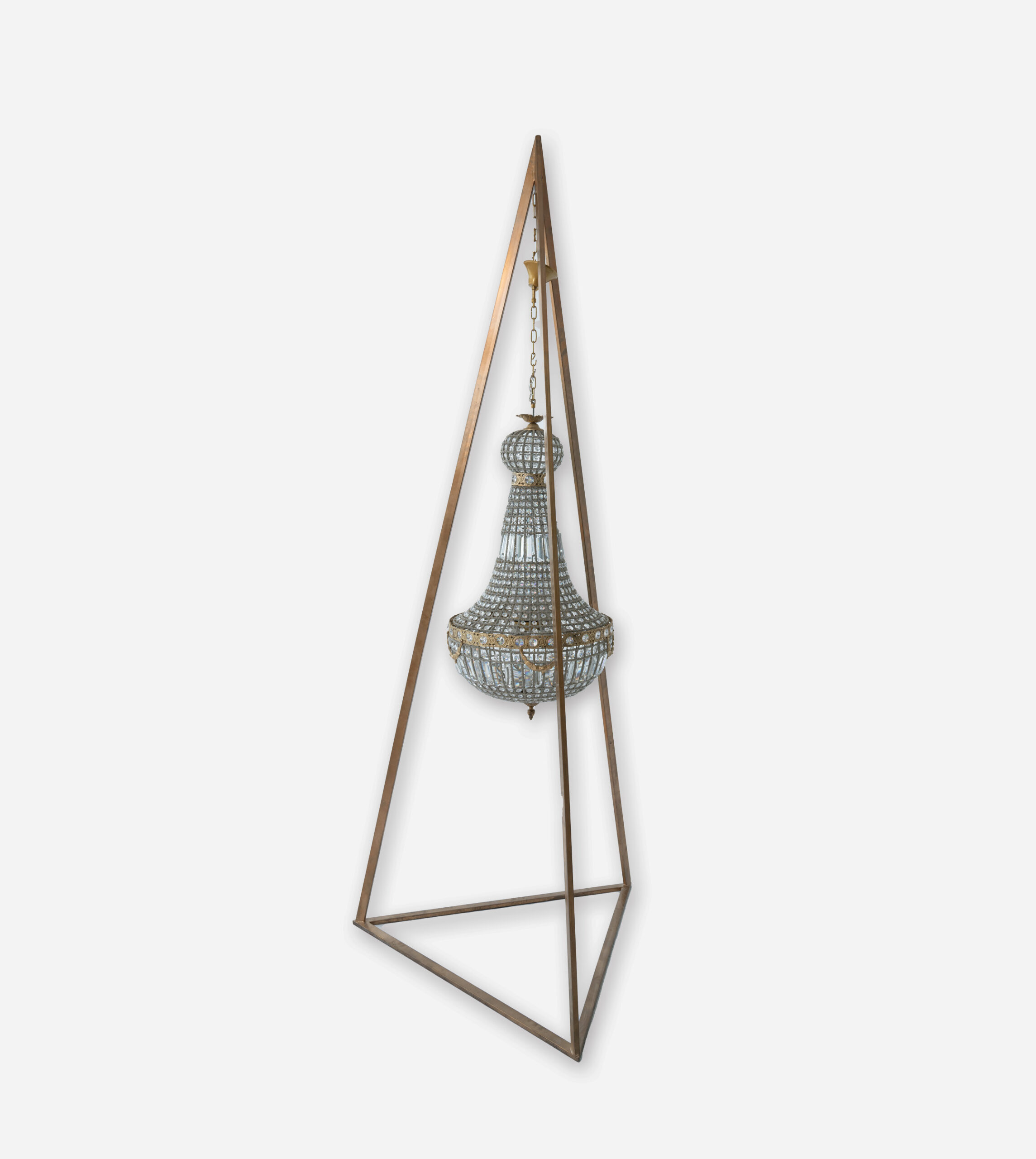 LUSTRE MAJESTUEUX AU DESIGN PYRAMIDAL, STRUCTURE EN METAL TRESSÉ ET ORNEMENTS EN CRISTAL TAILLÉ. IL APPORTE UNE TOUCHE D’ELEGANCE CLASSIQUE ET DE PRESTIGE A TOUT ESPACE, IDEAL POUR LES AMBIANCES SOPHISTIQUEES ET LES GRANDS VOLUMES.