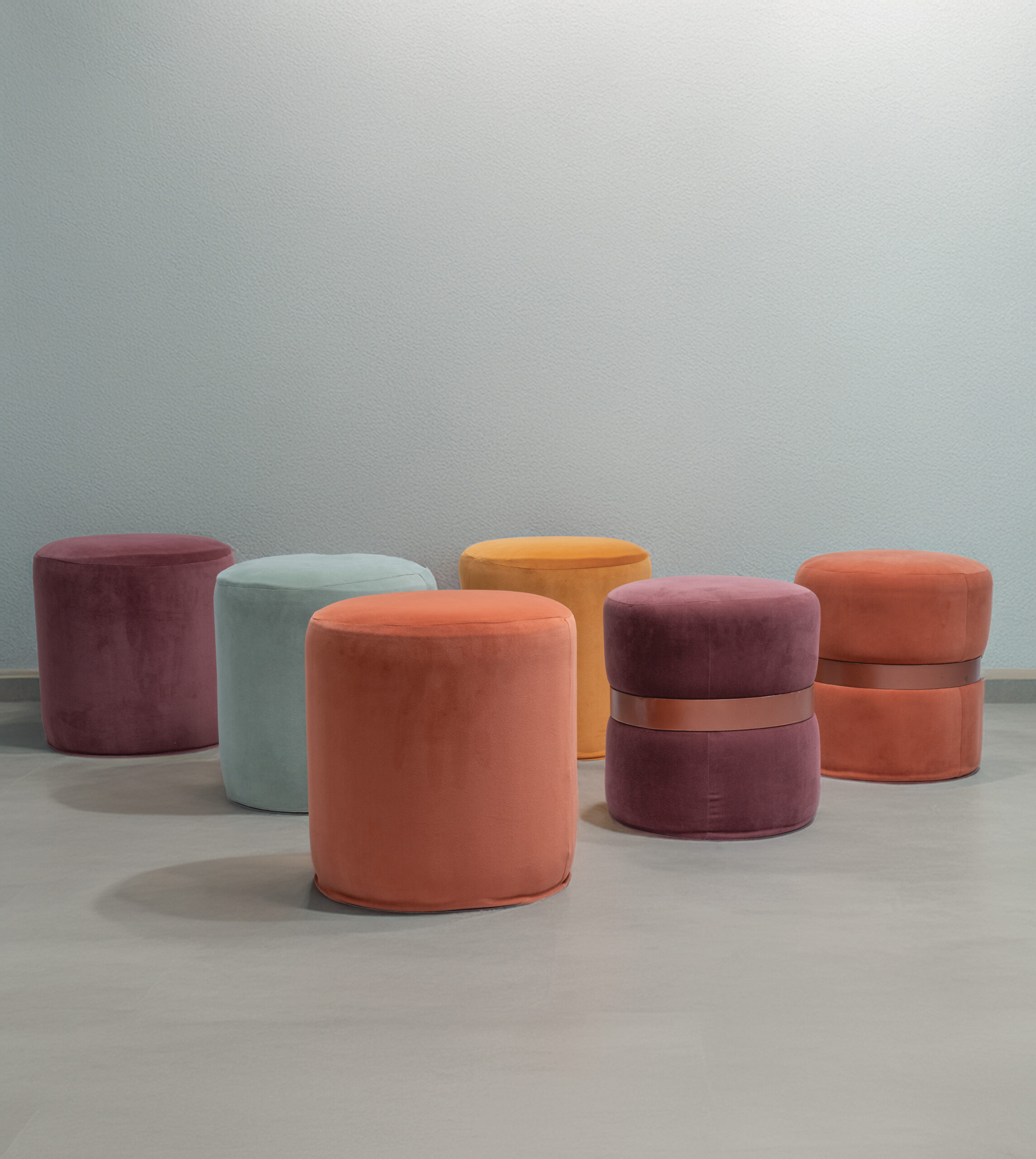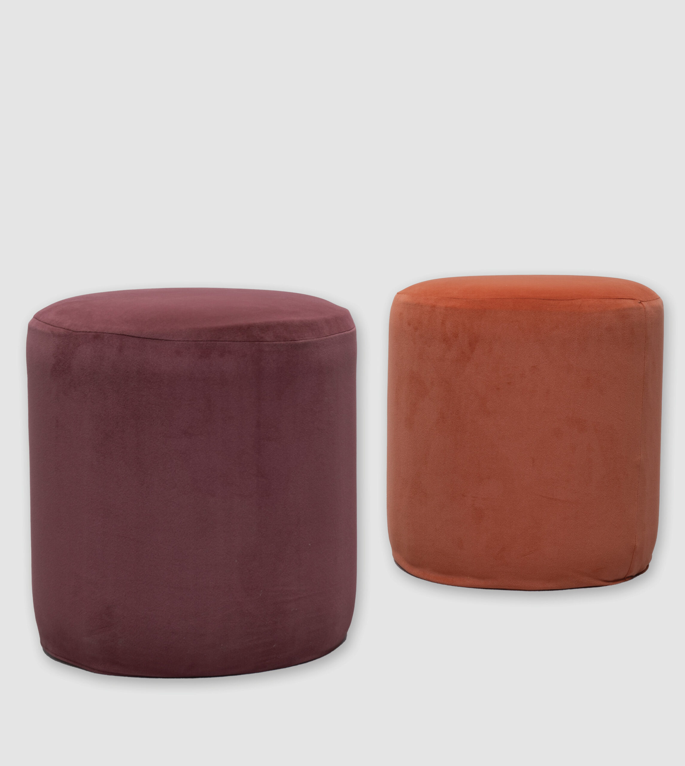 POUF EN VELOUR COULEUR POURPRE, S’ASSOCIANT PARFAITEMENT AVEC LES FAUTEUILS ET CANAPÉS DE LA COLLECTION BUBBLE